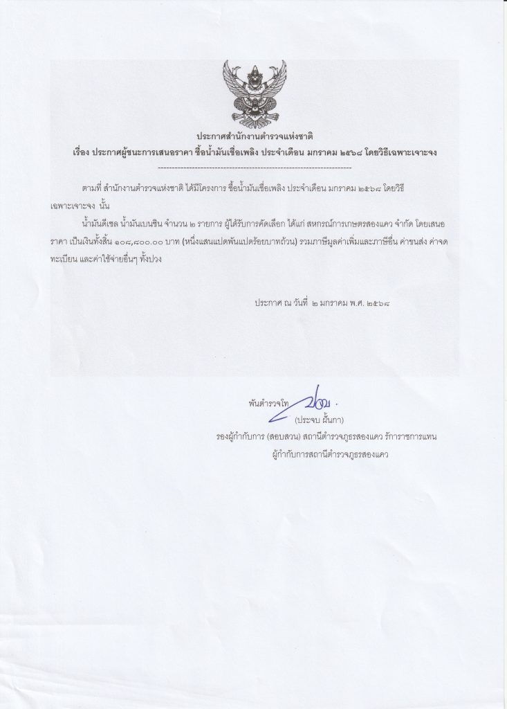 ประกาศจัดซื้อจัดจ้าง เดือน มกราคม 2568 31/01/2568 โดย police / ข่าวจัดซื้อจัดจ้าง,ประกาศจัดซื้อจัดจ้าง ประกาศผู้ชนะการเสนอราคา ชื่อน้ำมันเชื่อเพลิง ประจำเดือน มกราคม 2568 โดยวิธีเฉพาะเจาะจงตามที่ สำนักงานตำรวจแห่งชาติ ได้มีโครงการ ซื้อน้ำมันเชื่อเพลิง ประจำเดือน มกราคม 2568 โดยวิธีเฉพาะเจาะจง นั้น น้ำมันดีเซล น้ำมันเบนชิน จำนวน 2 รายการ ผู้ได้รับการคัดเลือก ได้แก่ สหกรณ์การเกษตรสองแคว จำกัด โดยเสนอราคา เป็นเงินทั้งสิ้น 108,800 บาท (หนึ่งแสนแปดพันแปดร้อยบาทถ้วน) รวมภาษีมูลค่าเพิ่มและภาษีอื่น ค่าขนส่ง ค่าจดทะเบียน และค่าใช้จ่ายอื่นๆ ทั้งปวง ประกาศ ณ วันที่ 2 มกราคม พ.ศ. 2568 FacebookFacebookXTwitterLINELine