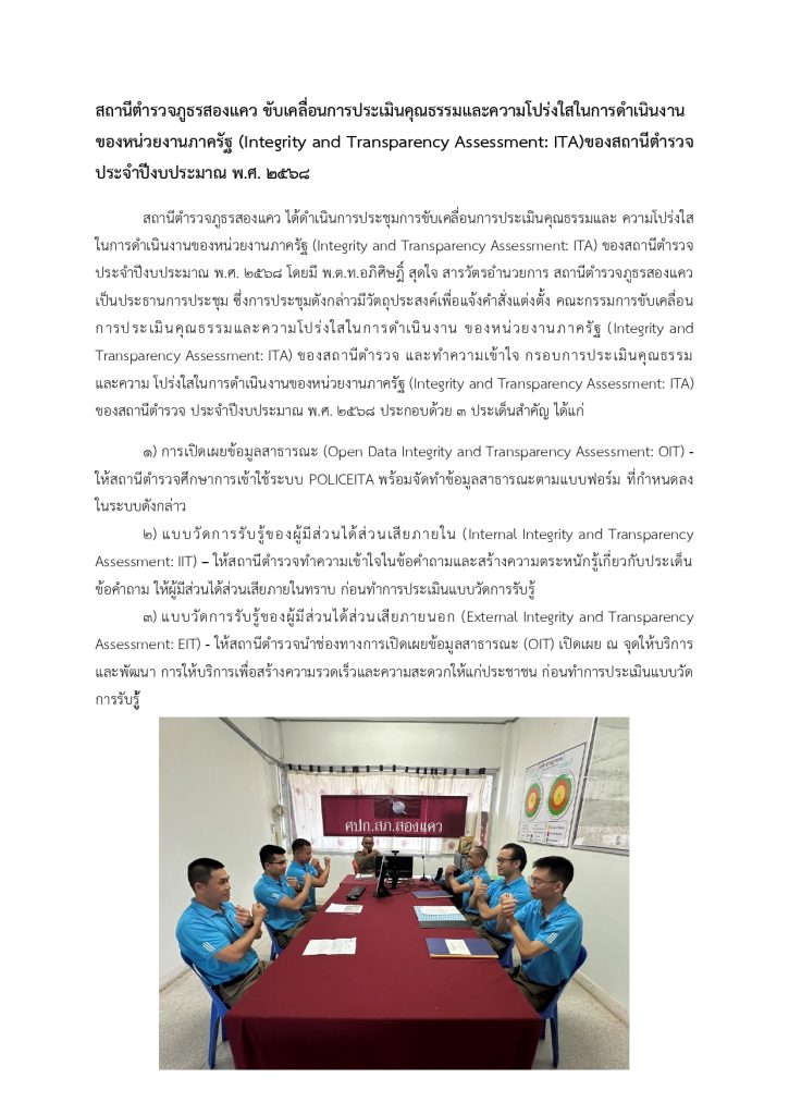 วันที่ 30 มกราคม 2568 โดยการอำนวยการของ พ.ต.ท.ประจบ ฝั้นกา รอง ผกก.(สอบสวน) รรท.ผกก.สภ.สองแคว จัดประชุมรับฟังแนวทางการประเมินแบบวัดการรับรู้ของผู้มีส่วนได้ส่วนเสียภายใน (IIT) และการประเมินแบบวัดการรับรู้ของนี้มีส่วนได้ส่วนเสียภายนอก (EIT)ตามการประเมินคุณธรรมละความโปร่งใสในการค้าเนินงานของหน่วยงานภาครัฐ (ITA) ประจำปี งบประมาณ พ.ศ. 2568 ให้กับข้าราชการตำรวจในสังกัด เพื่อขี้แจงและสร้างความเข้าใจร่วมกันเกี่ยวกับแบบประเมิน IIT และ EIT พร้อมทั้งขับเคลื่อนการประเมินคุณธรรมและความโปร่งใส ณ ห้องประชุม สภ.สองแคว สามารถสร้างความรับรู้ และความเข้าใจให้กับบุคลากร ต่อข้อคำถามตามแบบวัดการรับรู้ของผู้มีส่วนได้ส่วนเสียภายใน (IIT) และและแบบวัดการรับรู้ของผู้มีส่วนได้ส่วนเสียภายนอก (EIT)เพื่อให้สามารถนำไปดำเนินการได้อย่างชัดเจน มีประสิทธิภาพ อีกทั้งสามารถสื่อสารสร้างความเข้าใจต่อผู้รับบริการผู้มีส่วนได้ส่วนเสียภายนอก เพื่อแสดงถึงความโปร่งใสในการปฏิบัติงาน รวมถึงพัฒนาภาพลักษณ์ขององค์กรให้ดียิ่งขึ้น