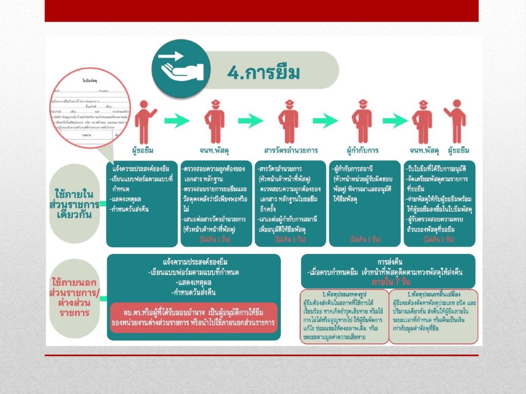 – กำหนดแนวทางการยืมหรือการเบิกจ่ายทรัพย์สินของราชการหรือของบริจาค